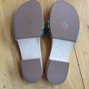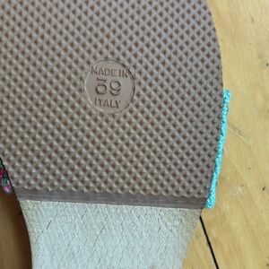 These Italian sandals feature a sleek design —needlepoint-like fish design-with a vibrant blue and green strap, perfect for casual summer outings. The flat sole and comfortable footbed ensure all-day wearability. Ideal for adding a touch of color to your warm-weather wardrobe.They are wood with rubber soles on bottom as seen in picture.
