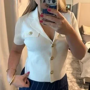 Chic Cream Short Sleeve Cardigan with Gold Buttons Old Money Style Workwear