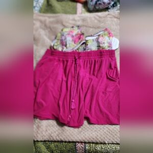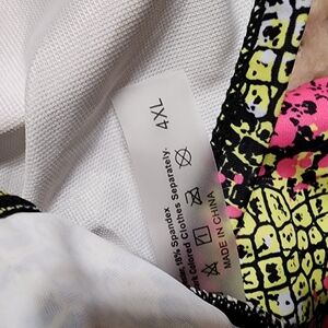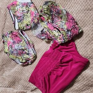 FREE SHORTS GENTLY USED 2x! Vibrant bikini with abstract pattern. Features pink and yellow hues. Perfect for summer. NWOT. 4x Sz 20 Top, Bottom and cute skirt cover up. FREE shorts too! 4 pieces!