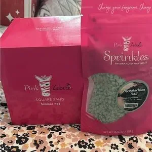 Pink Zebra Square Sand Simmer Pot with Appalachian Trail Sprinkles Wax Melts. Vibrant pink packaging. Brand new in box each never opened . Pot as pictured in second picture