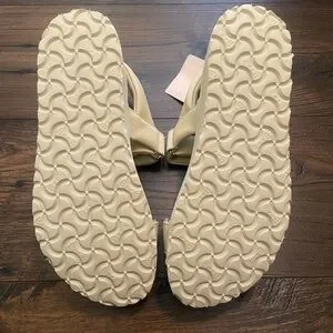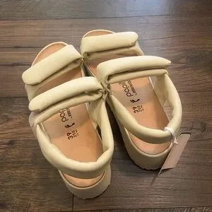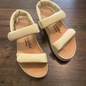 Experience ultimate comfort with Papillio's cream sandals, featuring a minimalist design with two wide, soft straps and a convenient velcro closure for easy adjustment. The flat sole and leather-like footbed ensure a comfortable fit, making them perfect for everyday wear.