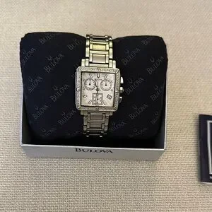 Stylish Bulova watch with a silver chronograph dial. Features a sleek metal bracelet. This was worn by me for about 3 years. I’ve taken very good care of it as you can see. My children got me a Rolex for my 70th birthday so that’s what I wear now. Thank you for looking at my Bulova Watch! I just put a new battery in it!