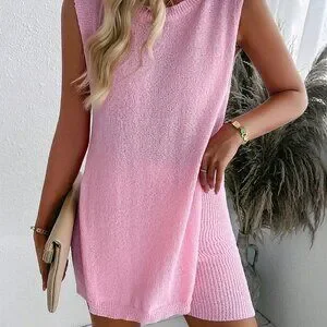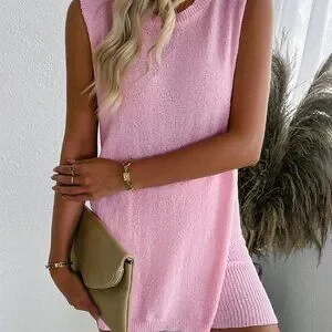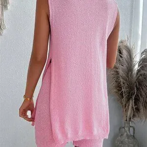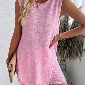 Pink Casual Women's Set: Loose Side Split Knit Vest And Shorts