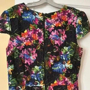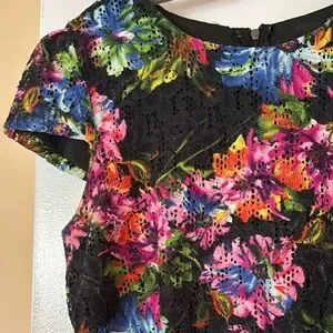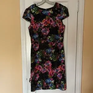 This elegant knee-length dress features a vibrant pink and red floral pattern, perfect for a wedding guest or cocktail occasion. The sheath style is complemented by flutter cap sleeves and a classic crew neck, adding a touch of sophistication. The dress's bold colors stand out beautifully against the dark base, making it a stunning choice for any event.