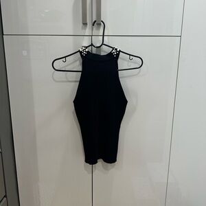 Elevate your style with this elegant black sleeveless top. Featuring exquisite pearl detailing around the neckline, this top is perfect for any occasion. Pair it with your favorite bottoms for a chic look.