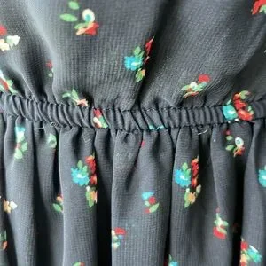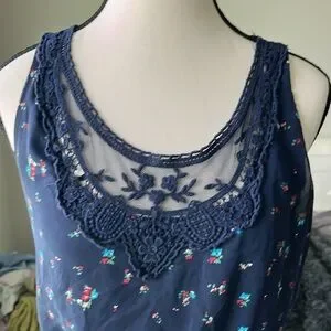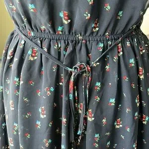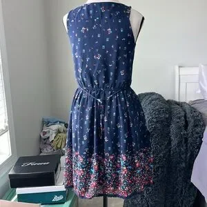 UP by Ultra Pink size small. Sleeveless mini sun dress. Navy with light blue, pink, and red flowers- concentrated primarily on the bottom. Scoop neck with a bit of lace mesh on the neckline. Elastic, cinch waist with string ties. Has pockets! Fully lined. A few loose threads but overall excellent used condition