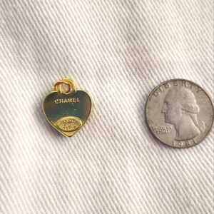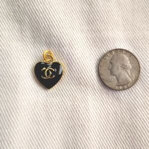 Elegant Chanel stamped heart zipper pull pendant in black with gold accents and the iconic CC logo on a 14k Gold plated chain-18in. Perfect for adding a touch of luxury to any outfit.