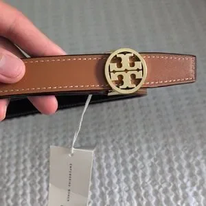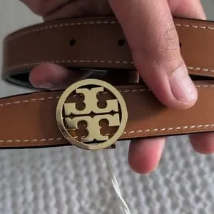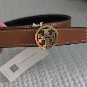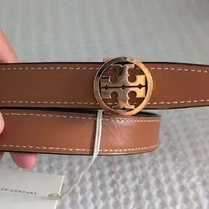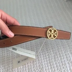 Elevate your style with the Tory Burch brown leather belt, featuring a striking gold buckle. Perfect for adding a touch of elegance to any outfit.
