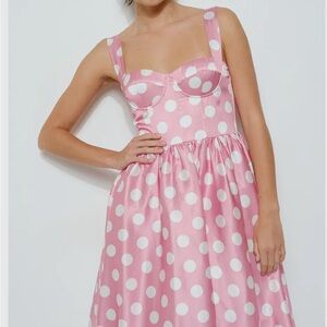This elegant sundress in a charming Pink and White. The sleeveless dress boasts a sweetheart neckline with lovely straps. Perfect for a wedding as a GUEST.