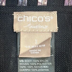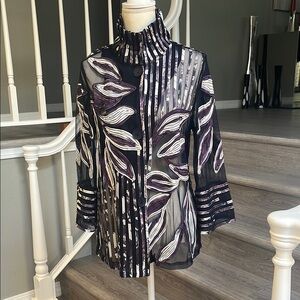 Stylish Chico’s Travelers sheer jacket with bold leaf ribbon patterns. Features a high collar, 3/4 flare sleeves and 3 button closure. Perfect for layering for special occasions or a night out. Bundle with other items from my closet for a greater discount and just one shipping fee. Reasonable offers considered. Smoke and pet free home.