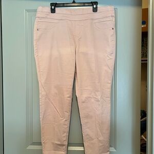 Light peach colored ankle pants (pick looks more coral, they are a lighter peach color) with faux front pockets and real back pockets. Measures approx. 19” across the front at the waist (unstretched) with a 27” inseam. Super comfy pull on styling with tummy support panel. Worn once, no damage or stains.