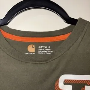 This Carhartt kids long sleeve shirt in olive green is built tough for active kids who need comfort and durability. Made from 100% cotton, this size Small (8-10) tee is soft, breathable, and perfect for everyday wear, school, play, or outdoor adventures. The classic Carhartt logo adds an authentic touch of rugged style.