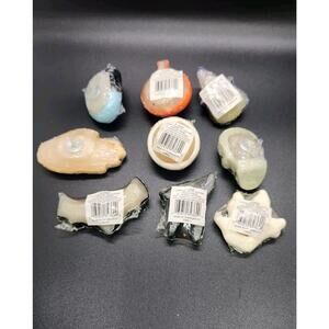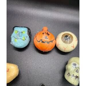This vintage lot of 9 Ganz Halloween Candles is perfect for adding a spooky touch to your Halloween decor. The candles come in a variety of colors, including skull, witch, pumpkin, cat, bat, eye, hand, zombie and a ghost designs. Each candle is made of wax and has a unique texture, making them a great addition to any collector's display.