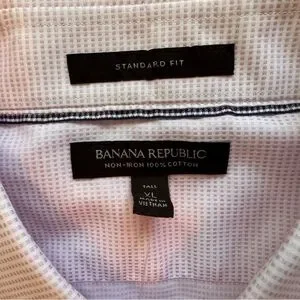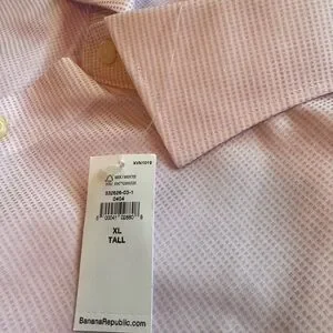 This Banana Republic dress shirt in a delicate pink hue features a 100% cotton, standard fit. Perfect for both formal and casual occasions. The pastel tone enhances its elegant appeal, making it a versatile addition to any outfit. XL tall. New with tag, (note: 2 small pulls as shown on last photo, on front bottom of shirt)
