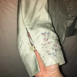 Embellishments on the collar, both shoulders down the front, sleeves, and on the waist of the skirt
