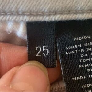 Size 25. Great condition. Color is “frostbite” - a very very light blue - almost white. 5 pocket zip front style. Raw hems. 90% Cotton, 6% EME, 4% Elastane. Very stretchy. Shown modeled on a size 0 mannequin. Approximate measurements (taken when laying flat / cannot guarantee fit):