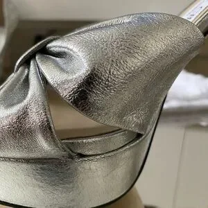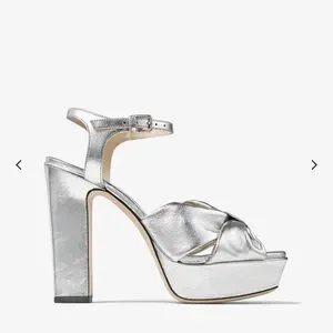 Heloise in metallic Nappa leather set on a 120mm block heel, and features feminine knotted straps that cross over the toes.