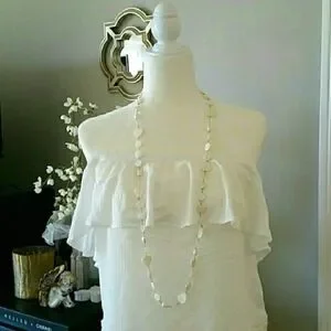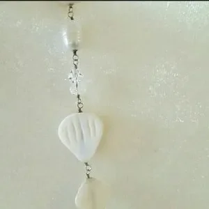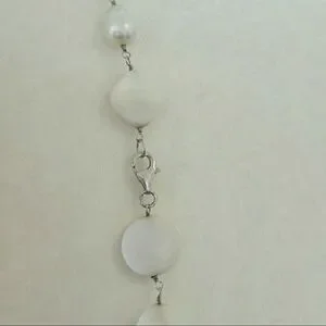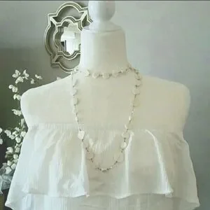 This glamorous necklace will be your staple piece! Its approx 43" long. Wear it by itself or layered or doubled up. It features mother of pearl in shell shapes, white/ivory stones, clear sparkling crystals, and faux pearls, on a sterling silver chain w/ lobster claw clasp. Colors are white ivory and tan. RL Scarf and tops not avail.