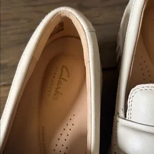 Experience the perfect blend of classic and contemporary with these Clarks cream flats. Featuring a slip-on design and a rugged, textured sole, these shoes offer both style and comfort. The smooth cream upper adds a touch of elegance to any outfit.