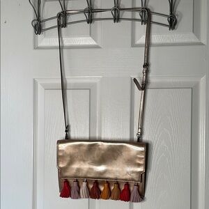 Chic metallic gold crossbody bag with colorful tassel accents. Perfect for adding a pop of color to any outfit.