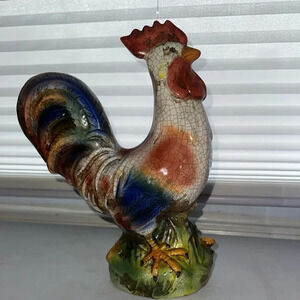 Add a touch of rustic charm to your home with this vintage ceramic rooster figurine. Perfect for farmhouse-style decor, this piece is ideal for shelves, mantels, or kitchen displays. It was gently used and displayed on a shelf, maintaining great condition. The vibrant colors and intricate details make it a great collectible or gift for rooster enthusiasts.