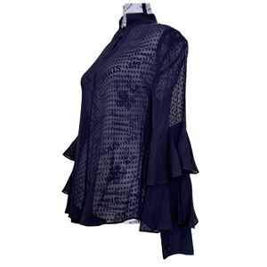 This stunning navy blouse features dramatic long bell sleeves with a cascading ruffled effect and an elegant mandarin collar.