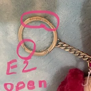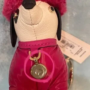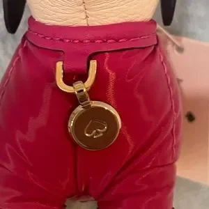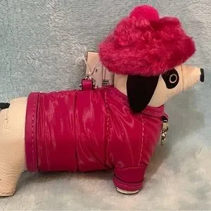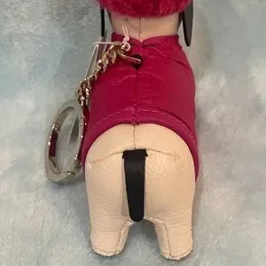 Claude has adorable pink jacket plus a fur hat. Leather with gold hardware.Adds cuteness to any bag, see pictures! Easy open key ring, the gold dog tag has Kate Spade logo😀. No longer in stores($129)