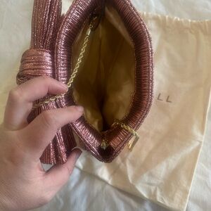 Elegant Loeffler Randall clutch in a shimmering pink hue. Perfect for adding a touch of glamour to any outfit.