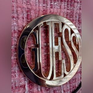Its signature golden hardware’s detailed front GUESS logo with pink leather trim adds a touch of elegance to its classic fashion design.