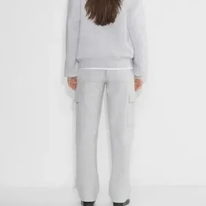 Comfortable gray track pants. Features side pockets. Perfect for casual wear.