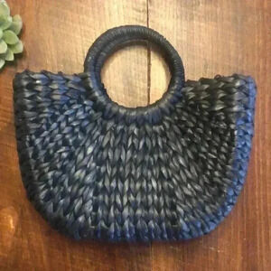 Black Woven Straw Handbag with Braided Ribbon Detail