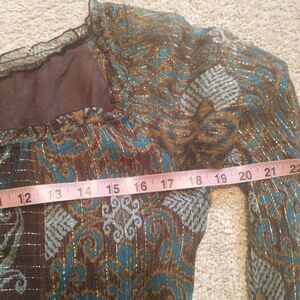 This elegant women's top features a stunning multicolor brown and teal design with metallic gold thread throughout. It has lining everywhere but the sleeves, which are sheer. Perfect for any occasion. The intricate patterns and vibrant colors make it a standout piece in your wardrobe. It really is quite gorgeous! It says small but could easily be a medium to large.