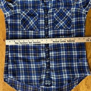 This beautiful Express navy blue and white plaid Portofino shirt features a concealed button front, point collar, long sleeves with button cuffs. In a relaxed style, it features an easy fit with a timeless silhouette. Shear, lightweight fabric.