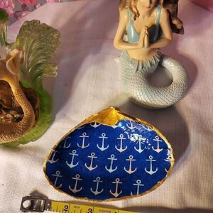 This shell is 5 inches by 4 inches. The colors are blue, white, tan. I glazed the the shell with 2 types of glaze, front and back. Adding a gold handpainted edge.
