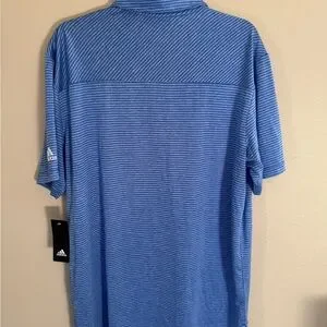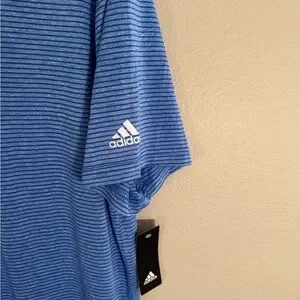 This Adidas polo shirt features a stylish horizontal striped pattern in alternating shades of blue, offering a clean and casual look. Made from a comfortable cotton blend, it is perfect for any casual occasion. The classic collar design adds a touch of sophistication to this versatile piece.