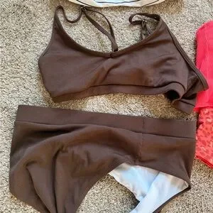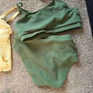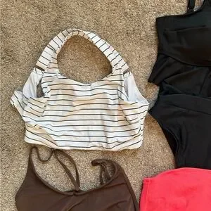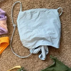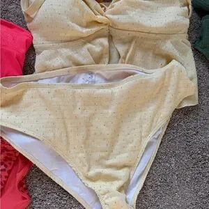 A vibrant collection of swimwear in various colors including black, purple, blue, yellow, and red. Perfect for mixing and matching.
