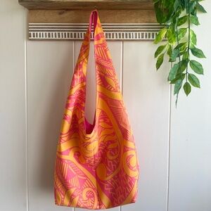 Add a pop of color to your outfit with this vibrant pink and orange women's bag. Perfect for any occasion. Polynesian print. Super vibrant orange and pink colors. Pocket on the inside and on the outside. Reversible. Newly made.