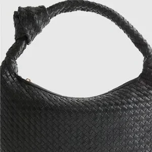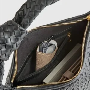 The Quince Black Italian Leather Handwoven Slouchy shoulder Bag showcases a unique woven texture, adding a touch of sophistication to its classic crescent shape. Handcrafted from the finest Italian leather, this spacious bag offers a blend of casual elegance and versatility, making it a perfect accessory for any outfit.