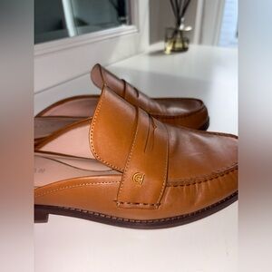 The handcrafted Cole Haan® Lux Pinch Penny Mule adds a touch of sophistication to your looks. These come with a round toe shape, laser forepart design for traction, ruched leather upper detailing, and welt stitch detail for added craftsmanship. The mules are designed with a leather lining, polyurethane insole, and 3D Lux Comfort sock providing layers of shock absorption, arch support, & exceptional cushioning designed for all day wear.