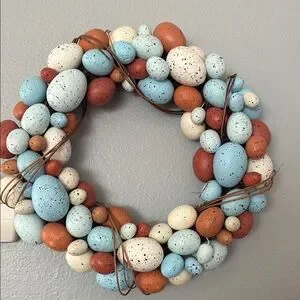 Beautiful wreath with speckled eggs in blue, white, and orange. Perfect for seasonal decor.