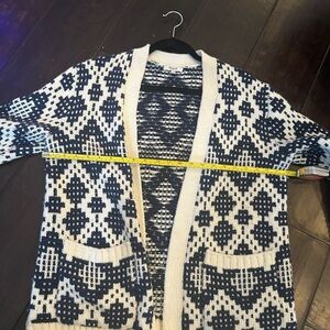 Madewell fair isle sweater / cardigan. Nice thick heavy weight. Gently worn. Size small. This is such a beautiful, heavy, SOFT sweater! Style E6033, Holiday 2015. Oversized. Great condition. Generous pockets. Color is navy and ivory