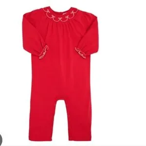 Adorable red baby romper with charming embroidered details. Perfect for any occasion.