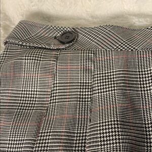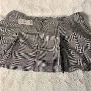 Chic plaid pleated mini skirt. Features a stylish black and gray pattern with subtle pink accents.
