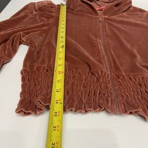 This Women's Velour Zip Up Hoodie in Salmon Color is a retro Y2K style activewear piece. Made from a blend of polyester, spandex, and cotton, this long-sleeve hoodie features a full zip closure and is machine washable. The hoodie is designed with a hood, pockets, and is suitable for various occasions such as walking, school, volleyball, dance, skateboarding, and cheerleading. Perfect for those who love the princess, leisure, Barbie, 90s, retro, and cheer themes, this hoodie offers a regular fit in size L.