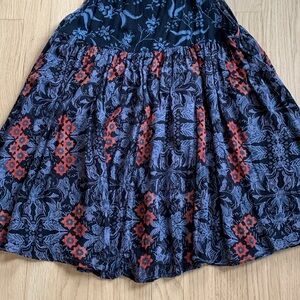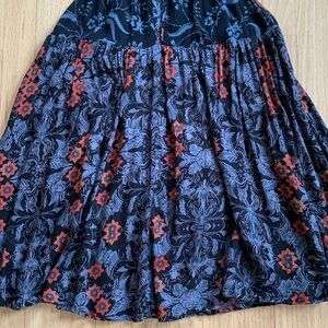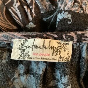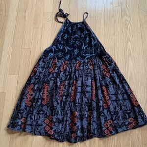 Free People Intimately Wildest Dreams floral mini dress with high neckline, keyhole front and shoulder tie detail. Loose and flowy fit. Color is black combo (black, grey and reddish orange). Size XS. Approximate measurements: pit to pit 18”, length 32”.