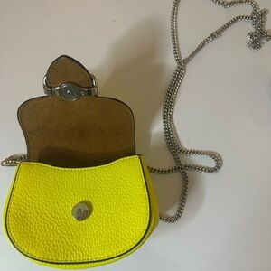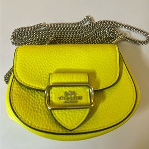 This vibrant yellow crossbody bag from Coach features a distinctive saddle shape and a luxurious pebbled leather finish. The silver-toned chain strap and clasp add FLASH!