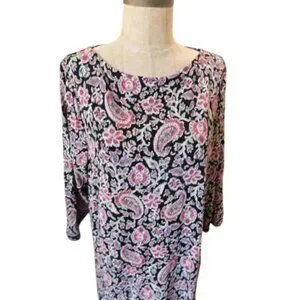 This J. Jill Wearever dress features a boho-inspired print and a comfortable stretch for all-day wear. Perfect for casual outings, it offers a flattering fit and stylish look. Scoop neckline, 3/4 sleeves, boho print, Lined and soft knit stretch fabric, loose fit and super cute and comfy- from the wear ever collection