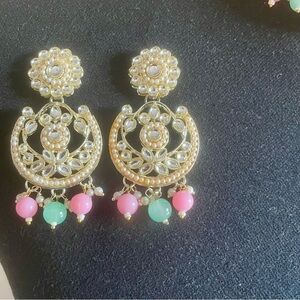 New! Beautiful, traditional Indian jewelry set featuring an intricate gold-tone choker necklace adorned with pink and green beads. Includes matching statement earrings and a maang tikka (forehead accessory). Perfect for weddings, parties, festivals, or special occasions. Lightweight, elegant, and ready to complete your ethnic look!