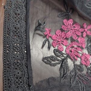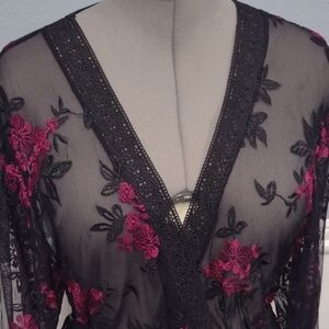 Kimono BabyDoll Black and Pink Floral Embroidered Mesh Robe