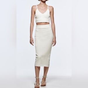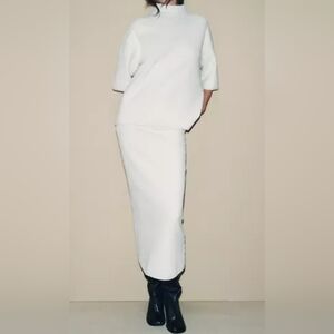Zara Women's Super Soft Ribbed Midi Skirt with Elastic Waist, White, LARGE